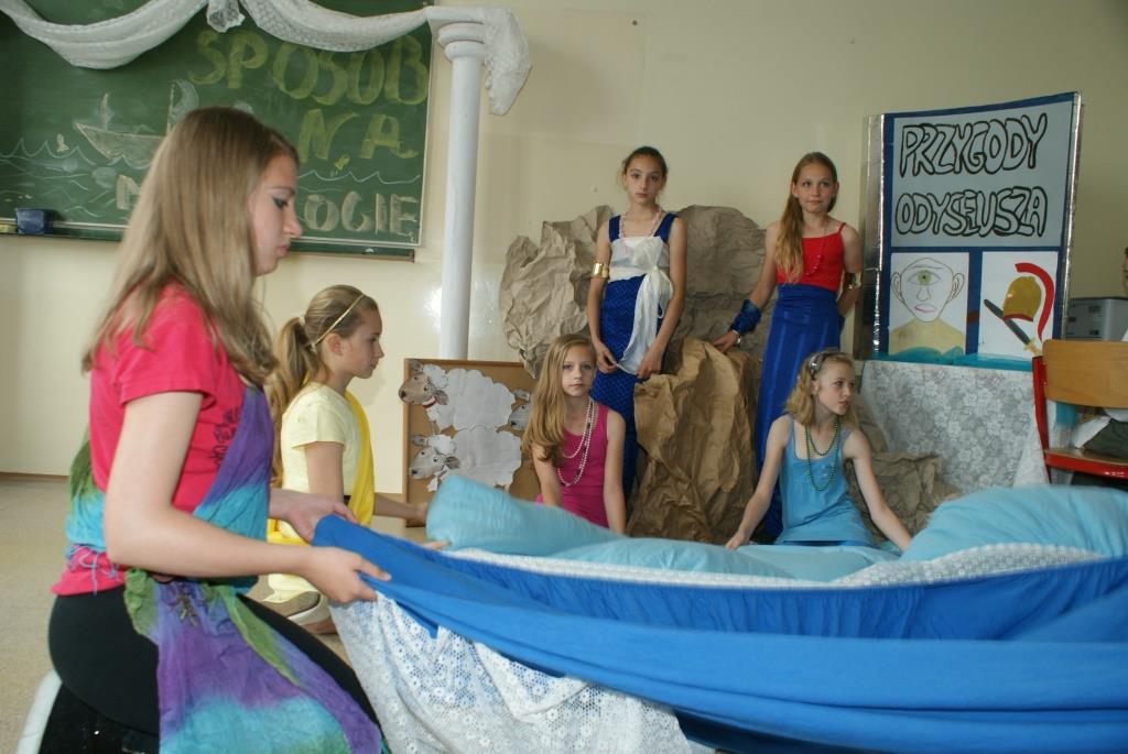 W tym dniu sala języka polskiego zamieniła się w komnatę pałacu w Itace, a zaproszeni goście -pani dyrektor oraz rodzice przenieśli się w niezwykły świat przygód Odyseusza. Gościli w jaskini cyklopa, wsłuchiwali się w czarujący śpiew syren, a następnie zaproszeni przez Telemacha i Penelopę uczestniczyli we wspaniałej uczcie z okazji szczęśliwego powrotu Odyseusza do domu.