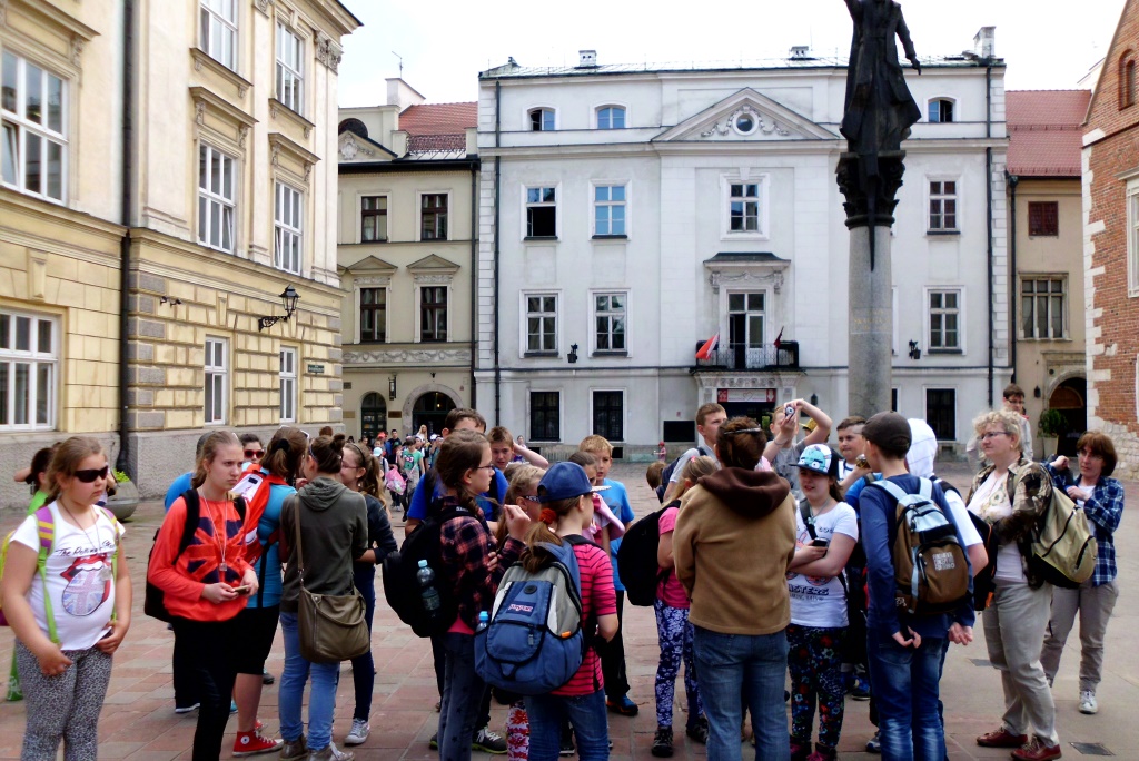 Następnie udaliśmy się do Krakowa. Po zjedzeniu obiadu w barze mlecznym (prawie jak u mamy) rozpoczęliśmy zwiedzanie Wawelu. Przywitaliśmy się ze smokiem wawelskim. Podziwialiśmy wnętrze katedry wawelskiej, odwiedziliśmy groby królów polskich i wielkich Polaków, weszliśmy na wieżę, by dotknąć serca Dzwonu Zygmunta… Zrobiliśmy zdjęcia na dziedzińcu. W drodze na Rynek wstąpiliśmy do Collegium Maius- najstarszego budynku Uniwersytetu Jagiellońskiego. Zadumaliśmy się przez chwilę pod oknem papieskim na Franciszkańskiej. Potem z zachwytem wpatrywaliśmy się we wspaniałe dzieło - Ołtarz Wita Stwosza w kościele Mariackim. Wreszcie szybkie zakupy pamiątek w Sukiennicach. Na koniec zwiedzanie podziemi Rynku Starego Miasta. W tym niesamowitym muzeum poczuliśmy się jak mieszkańcy średniowiecznego Krakowa- wsłuchiwaliśmy się w odgłosy rzemieślników i kupców, oglądaliśmy eksponaty wykopane przez archeologów. Jak na jeden dzień to z pewnością niemało! Zmęczeni, ale z głowami pełnymi nowych wiadomości i wrażeń przed nocą dotarliśmy do domów. Teraz z niecierpliwością czekamy na kolejną wycieczkę.