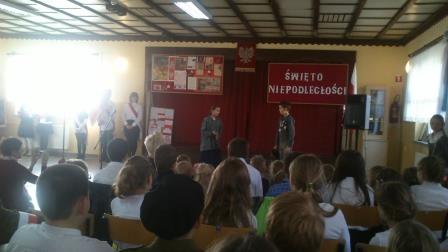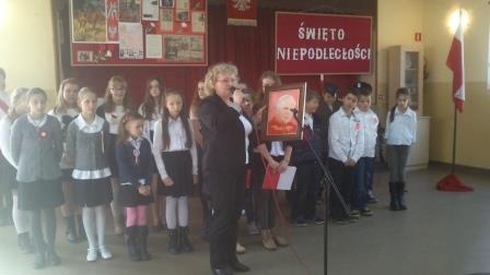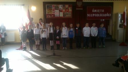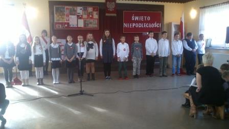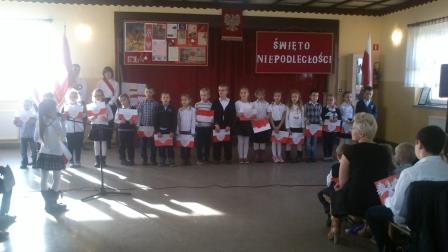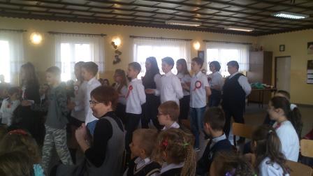 Umiejętności wokalne i recytatorskie zaprezentowały nie tylko wszystkie klasy, ale i przedszkolaki, które z dumą odśpiewały hymn państwowy i recytowały wiersze o naszych symbolach narodowych.