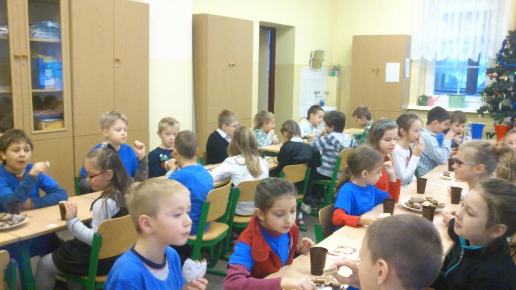 Zgodnie z naszą tradycją w ostatnim dniu nauki przed przerwą świąteczną wszyscy uczniowie kl. I-III razem z wychowawcami spotkali się na szkolnej wigilii. Wspólnie podzieliliśmy się opłatkiem, złożyliśmy sobie życzenia i delektowaliśmy się świątecznymi piernikami. Na koniec wszyscy śpiewaliśmy kolędy.