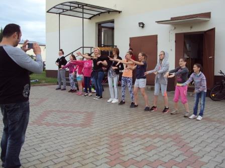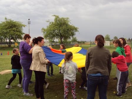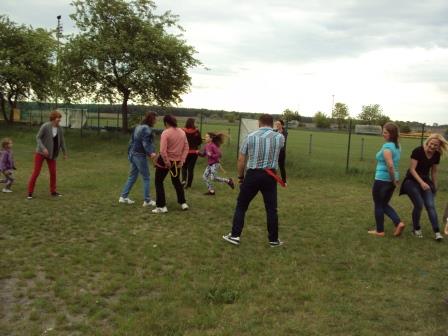 Następnie odbyły sie wspólne gry i zabawy ruchowe na boisku. Królowała piłka nożna, która zwerbowała na boisko zarówno chłopców starszych, czyli ojców jak i młodszych. Mecz obył się bez strat w ludziach, choć chwilami emocje brały górę. Wynik naprawdę był prawie nieważny, bo liczył sie zapał i radość ze wspólnego grania ojca , syna i ....córek.Młodsze dzieci i ich jeszcze mlodsze rodzeństwo oblegały tor przeszkód, potem były zabawy bieżne i zręcznościowe.