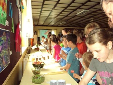 Festyn zdrowia 30.05.2015 zgromadził dzieci i rodziców najpierw w sali LZS a potem na boisku szkolnym.Podczas spotkania w LZS uczniowie zaprezentowali program mający zachęcić do bardziej świadomego jedzenia i gotowania.Pokazany został film pt. "Gorzka prawda o cukrze" z serii „Śmietnik w mojej głowie" (przygotowany przez Fundacje BOŚ)- który w zabawny sposób opowiada o funkcjonujących w społeczeństwie stereotypach, wpływających na jakość dokonywanych wyborów . I jak tu potem sięgnąć po coś smacznego...17 rodzin na szczęście i na osłodę przygotowało i wystawiło swoje zdrowe potrawy, czyli takie, które mają dużo zdrowego, zielonego i kolorowego z natury i które pięknie wygladają i jeszcze lepiej smakują. A więc sałatki, przekąski, przetwory, kanapki. Było pysznie, zdrowo, olorowo. Po degustacji i wyborze najlepszych pani dyrektor wręczyła dzieciom i ich rodzicom książki o tajnikach gotowania.