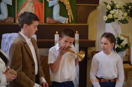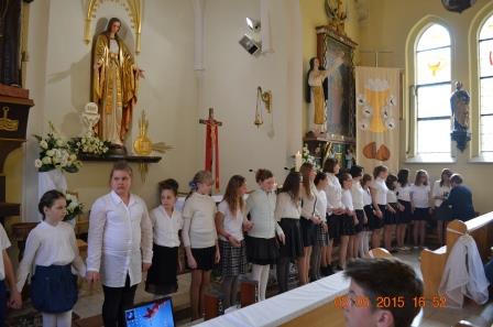 Uczniowie wraz z opiekunami i rodzcami 3 maja 2015 r modlili sie spiewem i pięknymi wierszami przy relikwiach Ojca Świętego, które w tym dniu gościły w Parafii Niepokalanego Poczęcia NMP w Piotrówce.