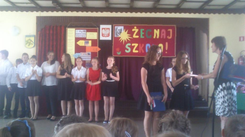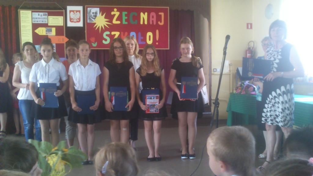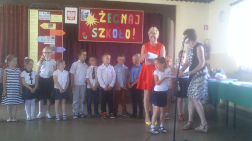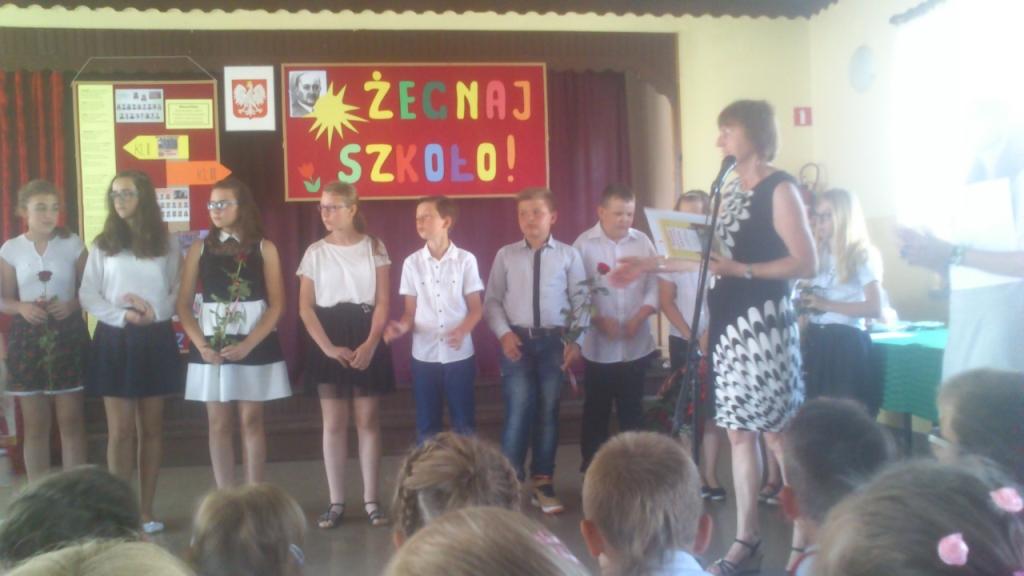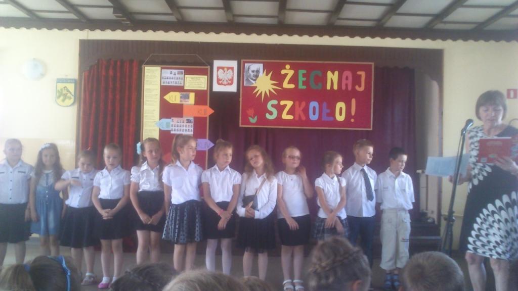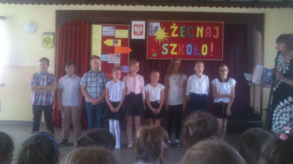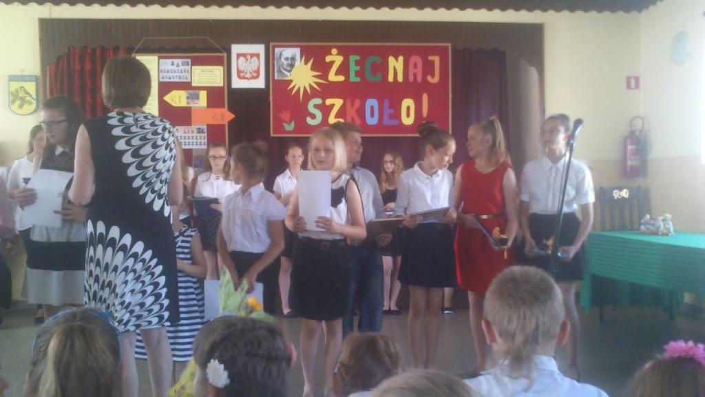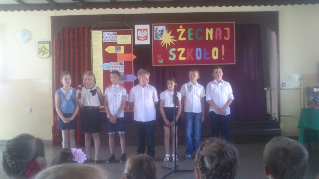 24 czerwca uroczyście zakończyliśmy rok szkolny 2015/2016. Naszą szkołę opuścili uczniowie klasy VI. Z tej okazji absolwenci zaprezentowali krótką część artystyczną, a ich koledzy z klasy V ciepło Ich pożegnali żartobliwymi wierszami i piosenkami. W swym występie, absolwenci w zabawnych wierszykach i piosenkach przywołali wydarzenia minionych sześciu lat. Między innymi tej nawiązującej do odbywających się Mistrzostw Europy w Piłce Nożnej we Francji: