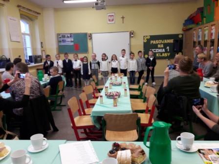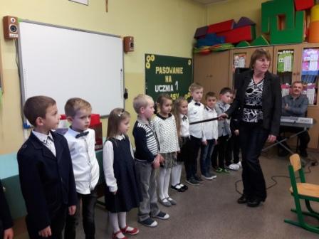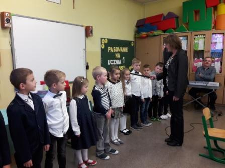We wtorek 10 października uczniowie klasy pierwszej mieli swoje wielkie święto. Na uroczystość przybyli rodzice i zaproszeni goście. Dzieci zaprezentowały się w krótkiej inscenizacji i pięknie zaśpiewały piosenki przy akompaniamencie p. Mariusza. Ich umiejętności i zaprezentowana wiedza została zaakceptowane przez panią dyrektor Barbarę Prokopiak, która pasowała wszystkich na ucznia klasy pierwszej. Na pamiątkę tego wydarzenia dzieci otrzymały okolicznościowe dyplomy i upominki przygotowane przez Radę Rodziców i sponsorów. Uroczystość zakończyła się wspólnym poczęstunkiem przygotowanym przez rodziców.