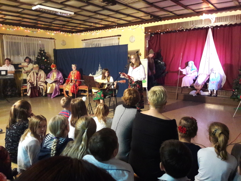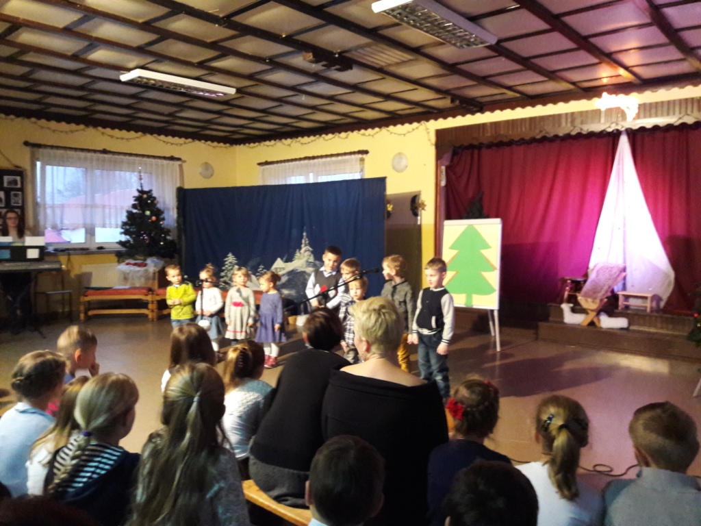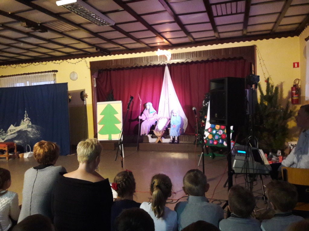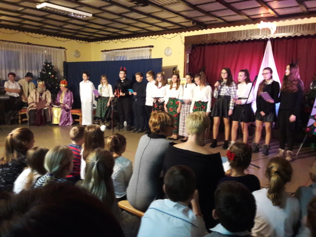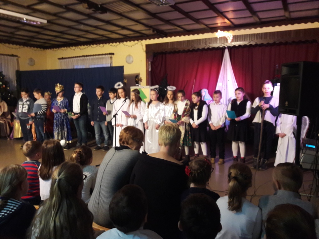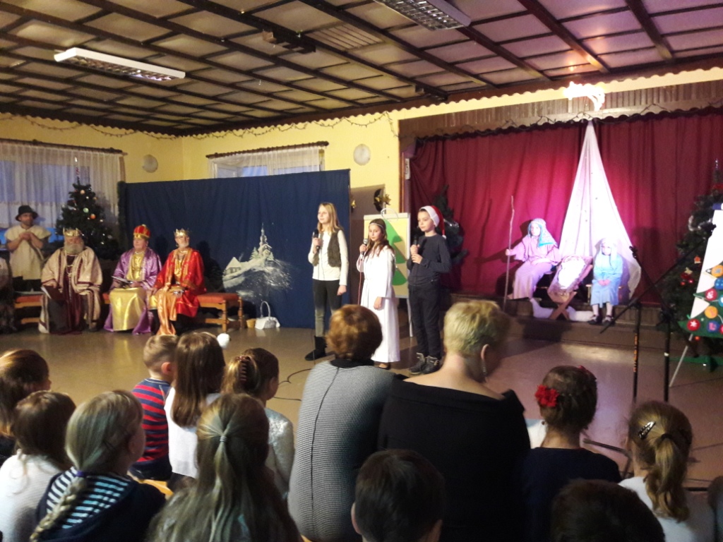 Na zakończenie w pięknej scenerii zespół uczniów naszej szkoły przedstawił Jasełka, które były bardzo dobrze przygotowane przez panią Emilię Szpiech. Interpretacja tekstów większości uczniów była iście aktorska.