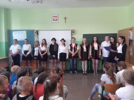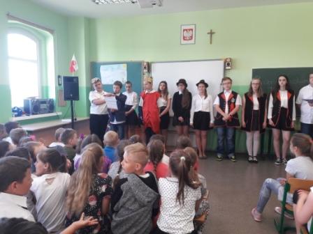 Z okazji święta Konstytucji 3 Maja uczniowie kl. VII przygotowali występ zaprezentowany na szkolnym apelu. W słowach wierszy i pieśni patriotycznych przybliżyli tematykę święta narodowego młodszym koleżankom i kolegom.