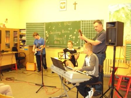 W czasie przerwy była okazja zobaczyć i posłuchać szkolnego zespołu instrumentalnego w składzie: Aneta Dworaczek- gitara, Dawid Koźlik- keyboard, Wojciech Piotrowski-gitara elektryczna i pan Mariusz Cierpich.