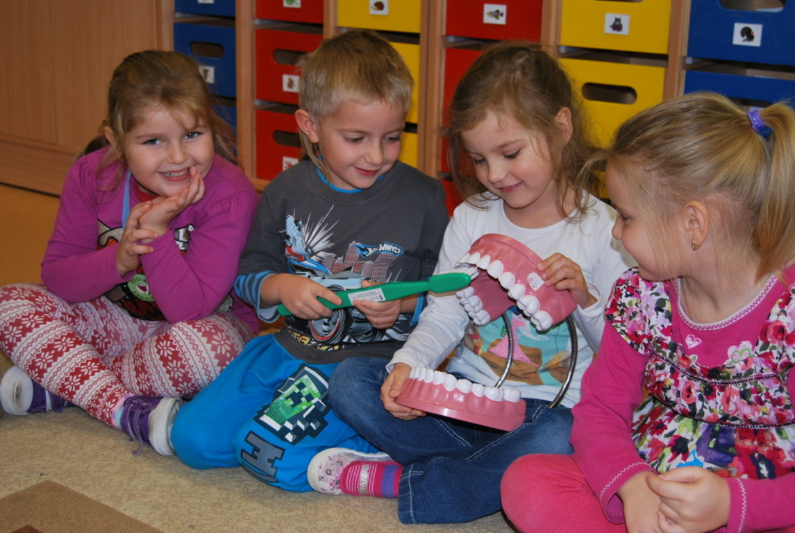 W ramach realizacji w miesiącu październiku tematu „Dbamy o zdrowie” przedszkolaki dowiedziały się, jak dbać o zęby i higienę jamy ustnej. Rozmawiały o konieczności codziennego dbania o zęby, uczyły się prawidłowego ich szczotkowania. Wspólnie ustaliły listę produktów zdrowych i szkodliwych dla zębów. Dzieci były bardzo zainteresowane tematem, posiadały dużą wiedzę na ten temat, nie brakowało też pytań. Wysłuchały opowiadania „Pracowitość i porządek”. Jednogłośnie obiecały systematycznie kontrolować stan swojego uzębienia.