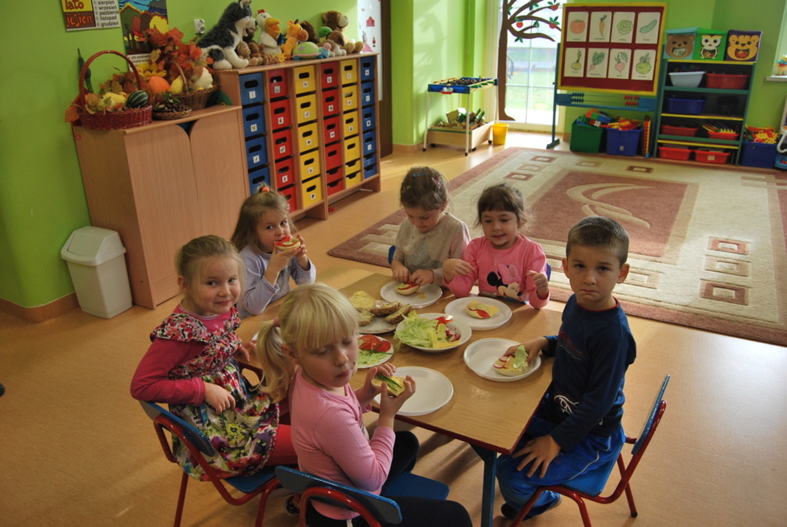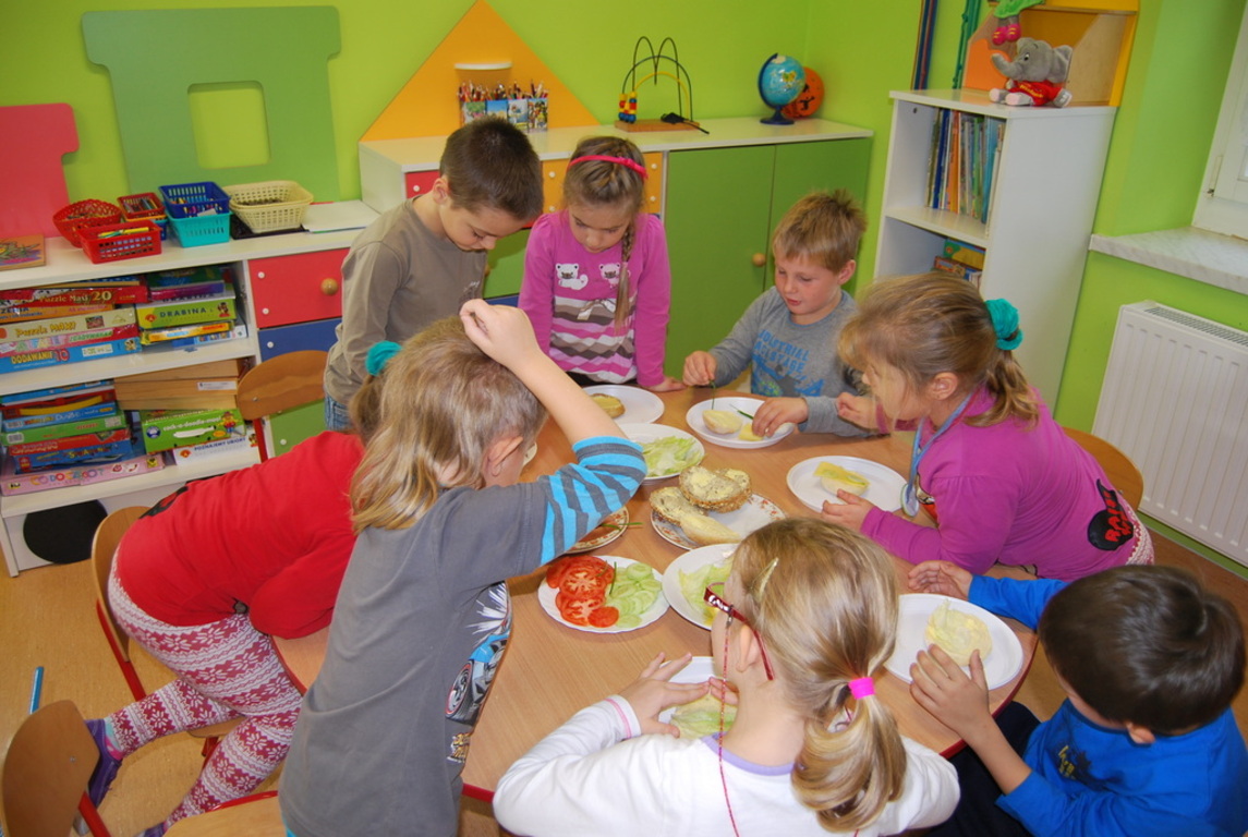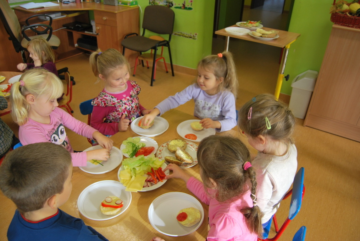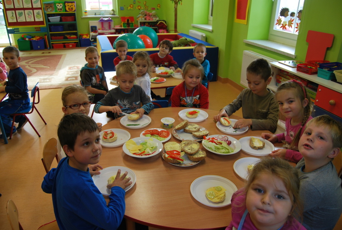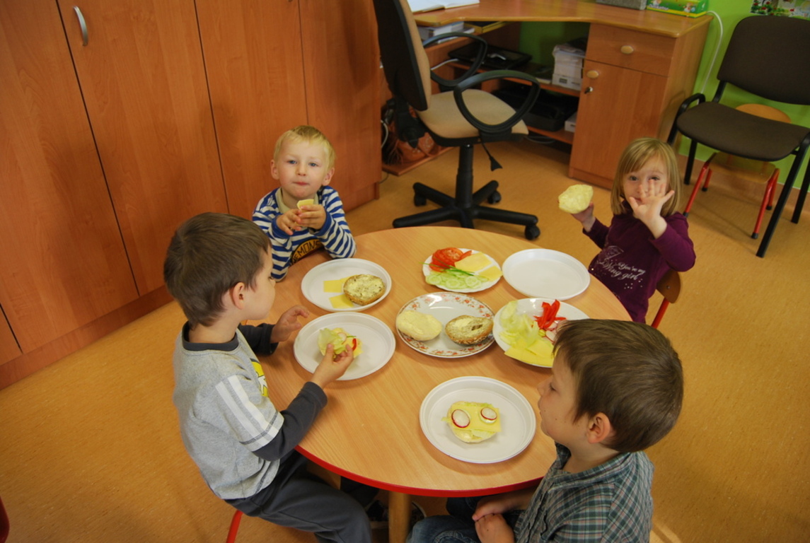 Kolejno dzieci miały okazję wysłuchać ciekawej pogadanki na temat zdrowego stylu życia pod hasłem "Odżywiaj się tak, by nie dopadł cię rak". Poprzez zabawy i konkursy przedszkolaki uświadomiły sobie jak ważna jest wysoka wartość odżywcza produktów które spożywamy. Dzieci zrozumiały, że prawidłowe żywienie jest jednym z czynników, które mogą wspomagać walkę z drobnoustrojami, wzmacniać odporność oraz przyspieszać rekonwalescencję. Przedszkolaki z dużym entuzjazmem przygotowywały własne, kolorowe, a przede wszystkim zdrowe kanapki.