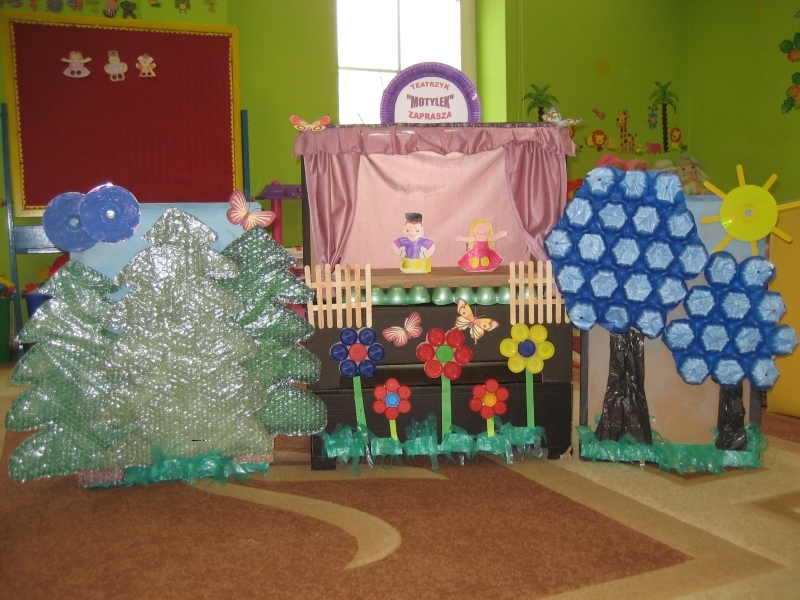 Tę wyobraźnię i świadomość dzieci naszego oddziału przedszkolnego wykorzystały tworząc pracę konkursową „Teatrzyk Motylek” z hasłem przewodnim Żyjmy zdrowo! Z śmieci zróbmy coś, niech nam służy do zabawy: z folii drzewo/z korka kwiat. Czysty będzie świat! Tworząc pracę wykorzystały: kartony, korki, folię, drut, płyty CD, patyczki do lodów, kubki jogurtowe, płótno.
