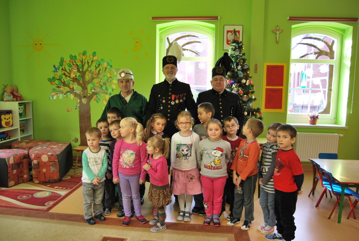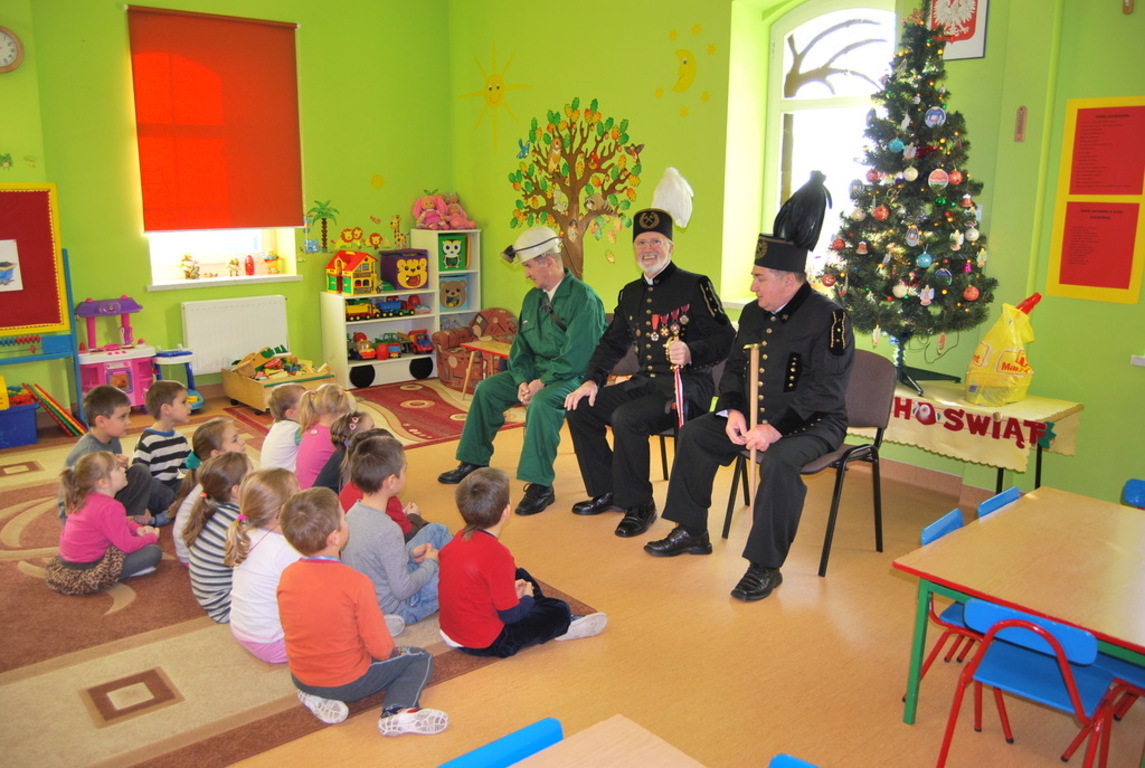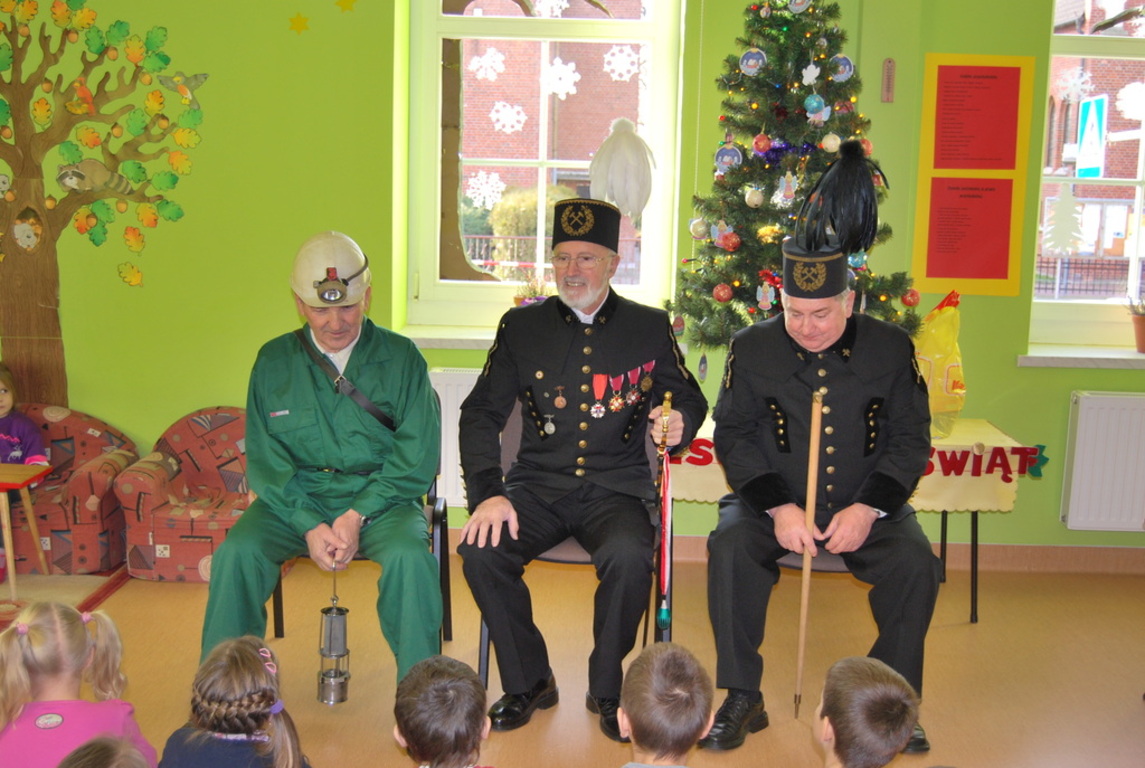 4 grudnia 2013 r. mieliśmy zaszczyt gościć w naszym przedszkolu 3 górników: pana Jana Buszmana, pana Henryka Kołodziej oraz pana Jerzego Kramarczyka. W dniu swojego święta panowie zaznajomili zaciekawionych przedszkolaków pracą w górnictwie, przybliżyli im zawód górnika. Dzieci z wielkim zaangażowaniem wsłuchiwały się w opowieści górników. Składamy serdeczne podziękowania za wizytę i zapraszamy za rok.